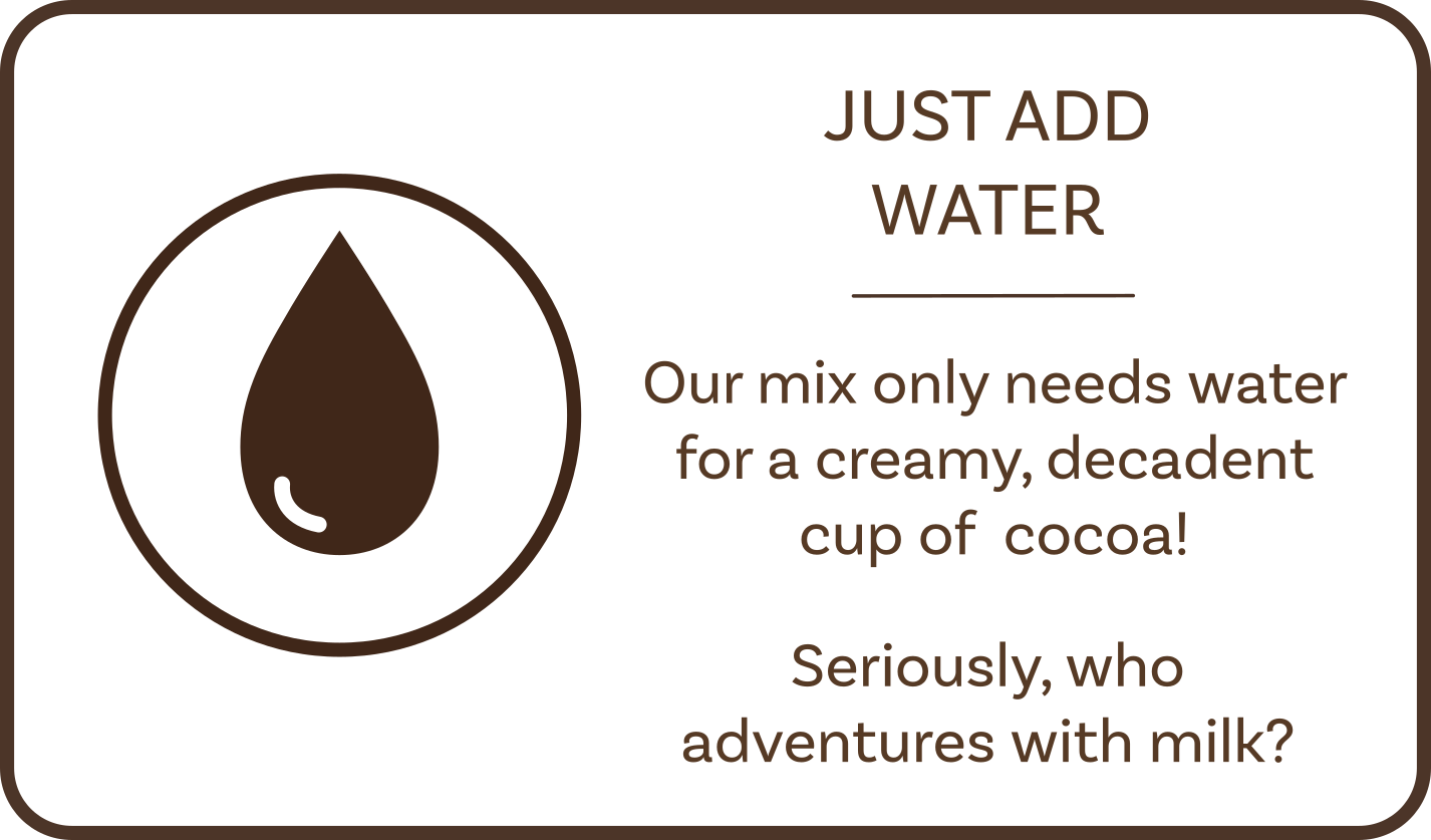 After a long, cold day on the slopes, we craved a real cup of hot cocoa. What we got was watery and flavorless. Tired of mixes that needed milk or had junk ingredients, we decided to make our own. Just add water, use simple ingredients, and actually tastes good. That's how Wander Hot Cocoa began-made for adventure and meant to be shared.